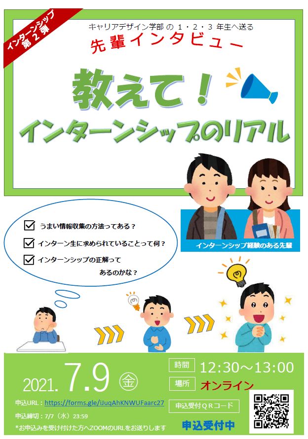 内容:インターンシップを制した先輩が語るインターンシップのすべて。質問にお答えいただく時間も設けます。