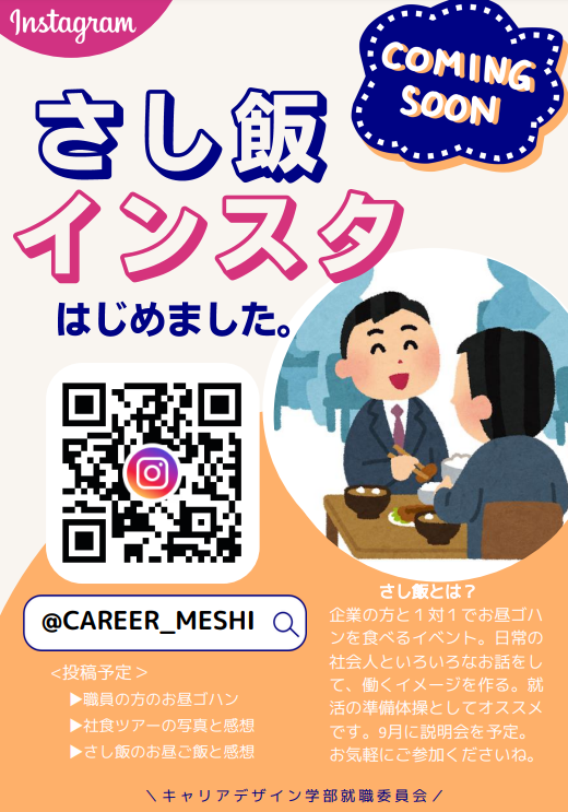 2023.06.12 【対象:1・2年生向け】就職委員会より「さし飯」イベントの実施について 「さし飯」って? 低学年向けに「働くイメージ」をつくるために、企業の方と1対1でお昼ゴハンを食べるイベント。 社会人の日常のアレコレを聞くことができる機会で、就活の準備体操としてオススメです。 現在、インスタグラムで様々な情報を発信中!ぜひフォローしてください。 イベント詳細について 9月以降、さし飯イベントについての詳しい説明会を予定しています。 このページとインスタグラムでお知らせいたしますので、お気軽にご参加ください。 この機会をお見逃しのないよう♪ ぜひ活用してくださいね。 一覧に戻る/Back