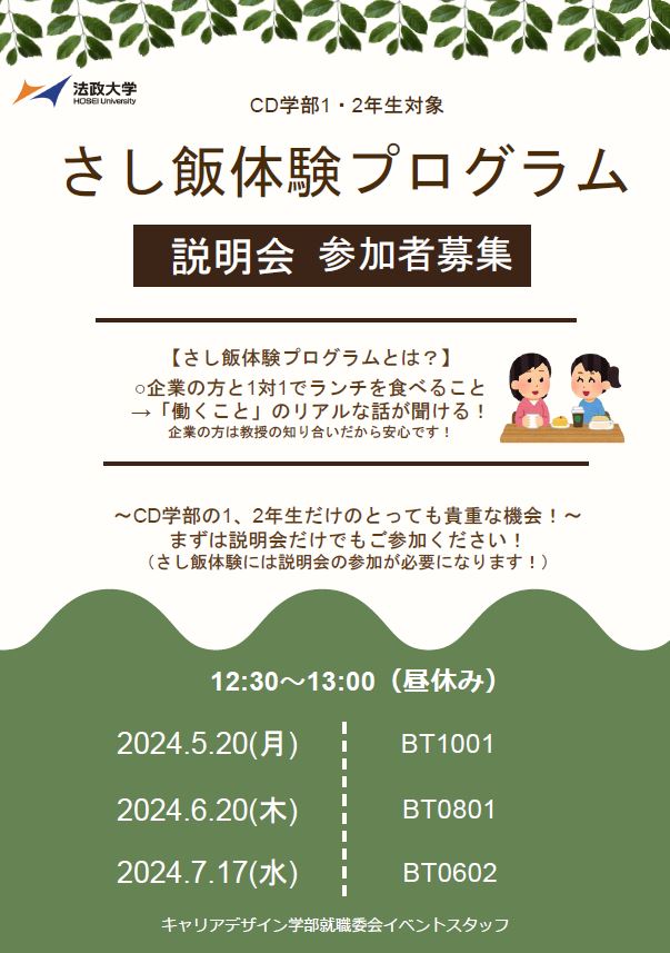 【対象:1,2年生】就職委員会より「さし飯体験プログラム」説明会開催のお知らせ(※7/15更新)