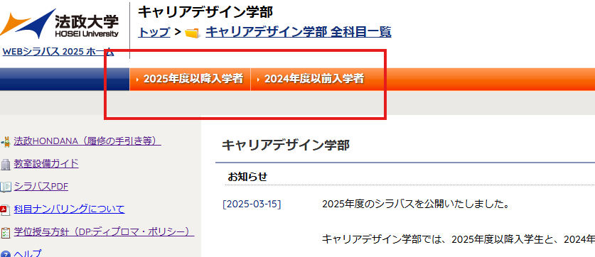 キャリアデザイン学部のシラバスは「2024年度以前入学生」と「2025年度以降入学生」で分かれています。