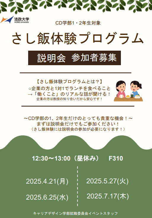 【対象:1・2年生】2025年春学期さし飯体験プログラム 説明会について(就職委員会)