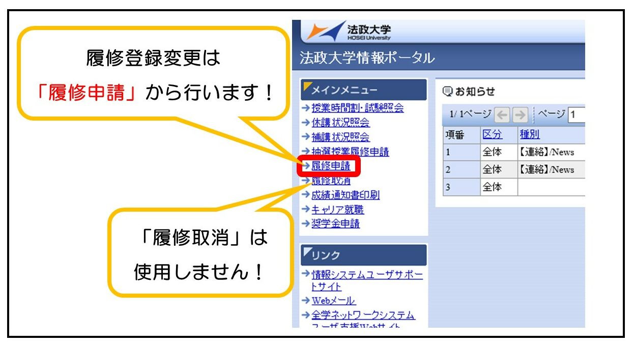 履修変更は、履修登録と同様の手順で、所定の期間に情報システムから行ってください。