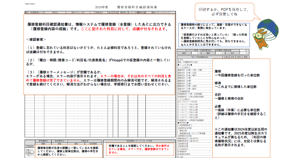 履修変更(登録)完了後、「履修登録科目確認通知書」を出力・保存し、科目に誤りがないか、エラーがないかを必ず確認してください。