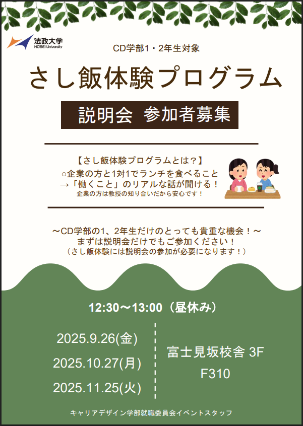 【対象:1・2年生】2025年秋学期さし飯体験プログラム 説明会について(就職委員会)